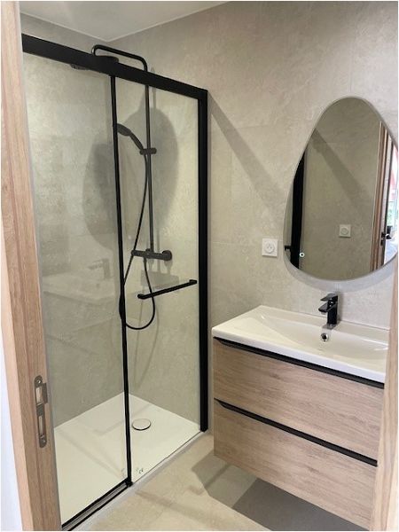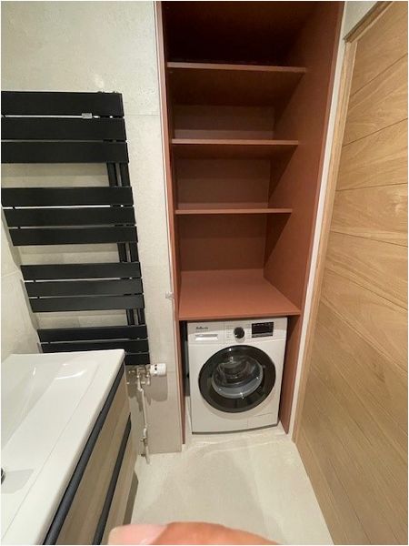 avec meuble-vasque et miroir, douche, étagères, une machine à laver et un radiateur sèche-serviettes, WC indépendant.