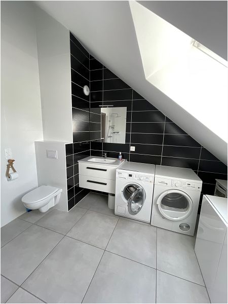 équipée d’un lit 2 personnes, d’une salle de bains avec meuble-vasque, douche à l’italienne, WC suspendu, lave-linge et sèche-linge,