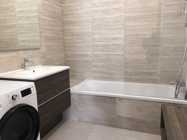 vaisselle), d’une chambre avec grand placard aménagé, d’une salle de bain avec meuble-vasque, baignoire, radiateur sèche-