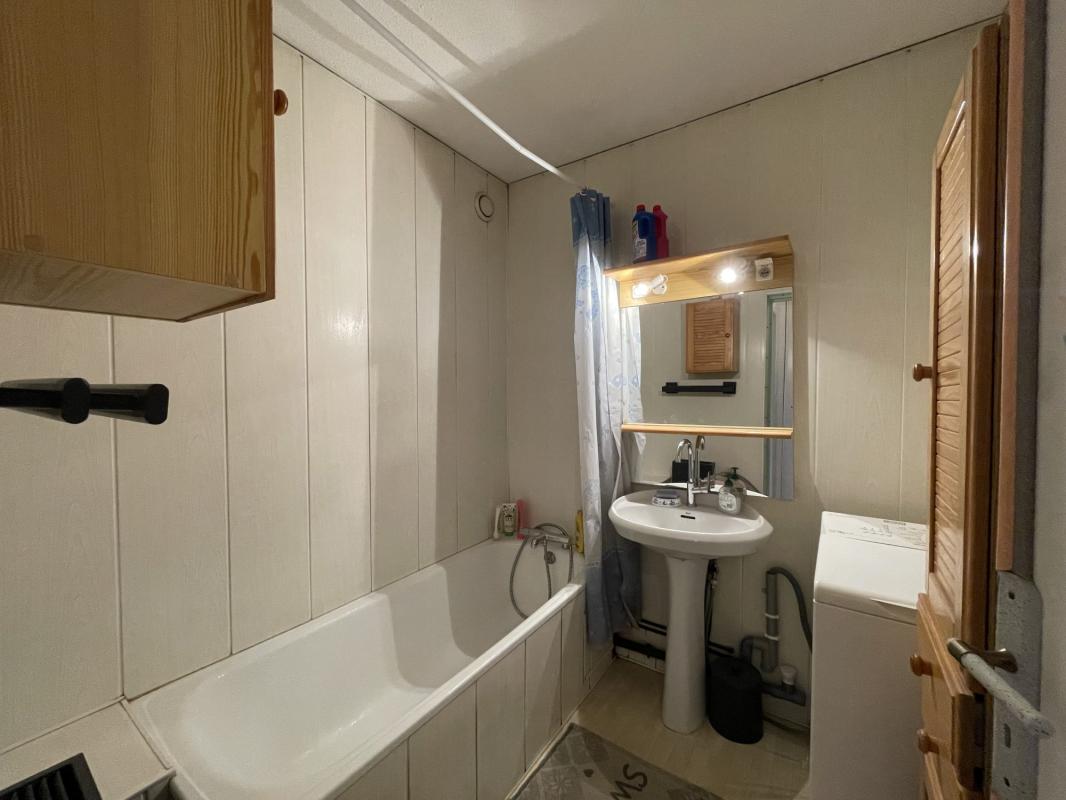 La partie nuit, séparée de l’espace de vie, comprend un couloir avec rangements, une chambre équipée d’un petit dressing et une salle de bains.