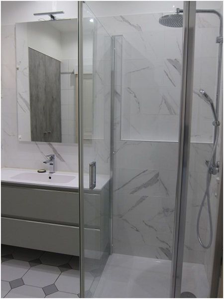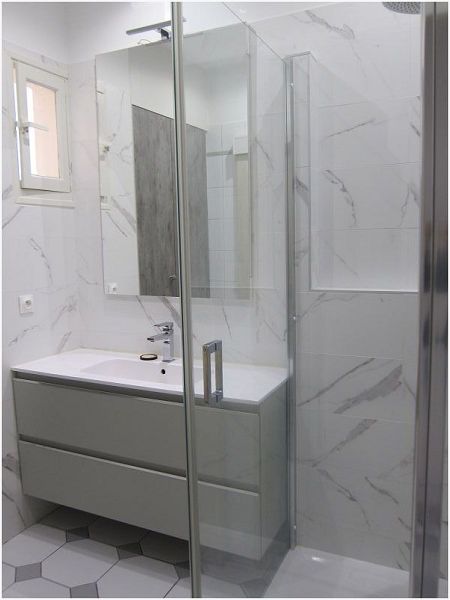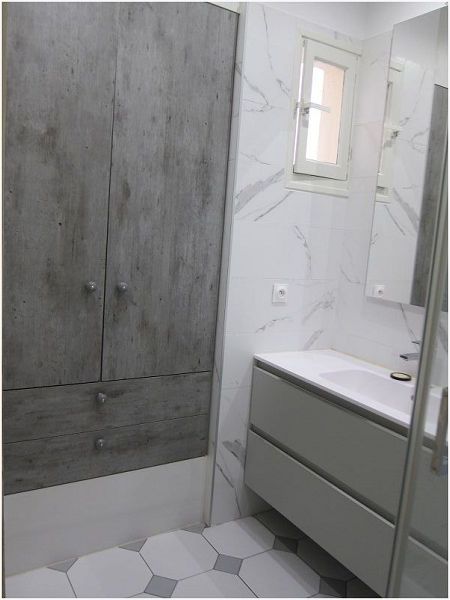 radiateur sèche-serviettes, placards et fenêtre, WC séparé, chauffage et eau chaude collectifs, double-vitrage, volets électriques,