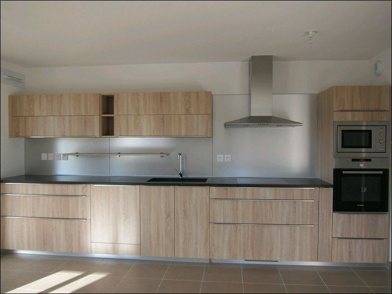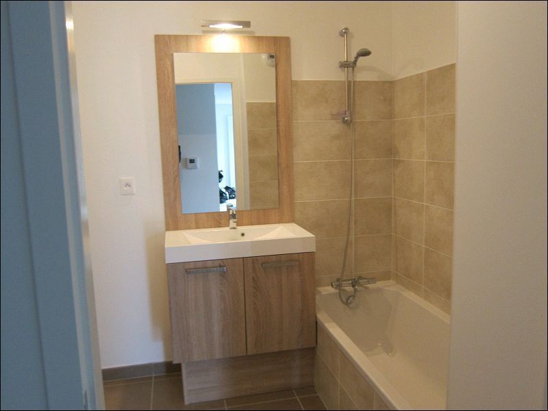 cuisine aménagée ouverte sur le séjour, 2 chambres dont 1 avec placard, salle de bain avec baignoire et meuble-vasque, WC