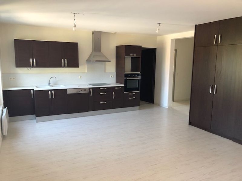 composé d’un séjour avec grand placard, cuisine ouverte et aménagée (éléments hauts et bas, hotte, plaque de cuisson, four et