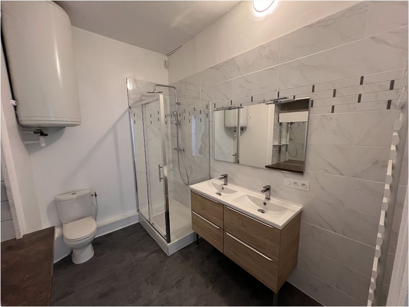 salle d’eau équipée d’une baignoire, d’un meuble-vasque et d’un branchement lave-linge, d’un WC avec lave-mains, nombreux placards,